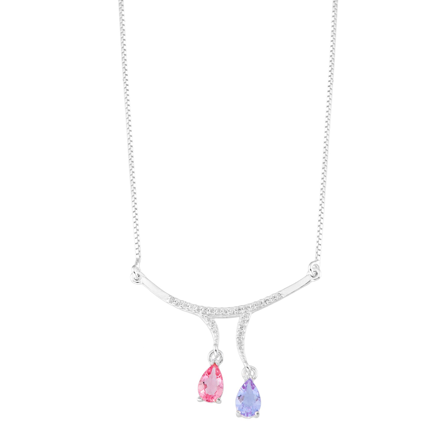 Cordão meia Lua cravejados em zirconia incolor e duas Gotas penduradas na pedra Cristal cor Safira rosa sintetica e lilas sintetica,