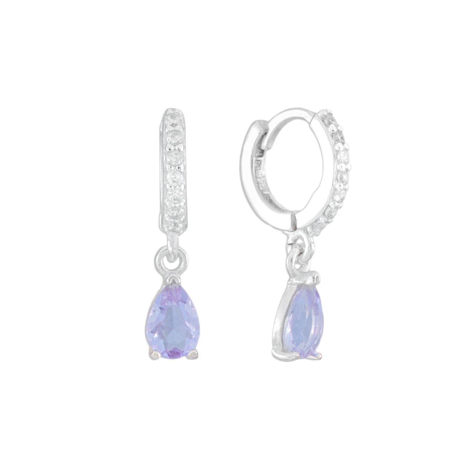 Brinco Argola de Clic com 10 mm de diâmetro com pedras Incolores em Zircônias e duas Gotas Penduradas no Tamanho 4x6 na Pedra Cristal Cor Lilás. Peças timbrada PL925 para Garantir a autenticidade da Joia produzida pela Landry Joias.